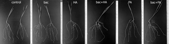 All treatment options (the use of HA and FA and bacterial treatment applied separately and in combination) led to an increase in the overall length of seminal roots, their mass, and number of lateral roots of wheat plants compared to the control (untreated plants) (Figure 1 and Figure 2). All treatments resulted in a similar increase in root length, while the impact on the number of lateral roots was greater when HSs were combined with bacteria. HA combined with bacteria led to a greater increase in the number of lateral roots than either bacteria or humic substances (HSs) applied alone. Root mass of plants treated with FA combined with bacteria was significantly heavier than in the case of FA applied alone, and intermediate between plants treated with bacteria + HA and those treated with bacteria and HA applied alone.