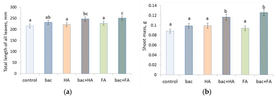Total length of all leaves (a) and shoot mass (b) of wheat plants 7 days after treatment with Pseudomonas plecoglossicida 2,4-D (bac), humic (HA), and fulvic (FA) acids, and their combinations (bac + HA and bac + FA). Means statistically significant difference from each other are indicated by different letters, p ≤ 0.05, n = 15 (ANOVA followed by Duncan’s test).