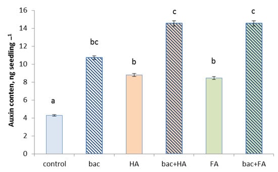 All treatment options (the use of HA and FA and bacterial treatment applied separately and in combination) increased auxin content in wheat seedlings (Figure 4). The greatest effect was detected when the combination of bacteria and HSs was applied.