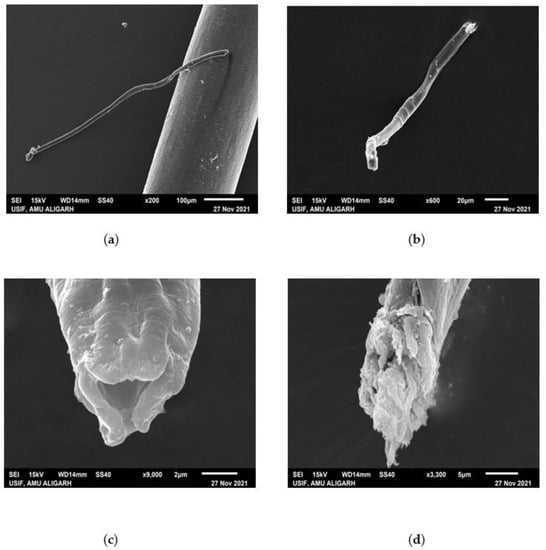SEM micrograph of untreated (a,c) and treated (b,d) Meloidogyne incognita. Untreated (a,c) shows no splitting and no deformation in the body of the nematode, whereas (b,d) when treated with G. lucidum for 3 days, clear deformation was found on the body of the nematode.