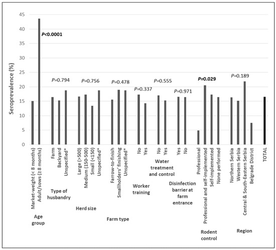 | Adult/sows (≥eight months) | 14.247 | 6.258–32.438 | <0.0001 |