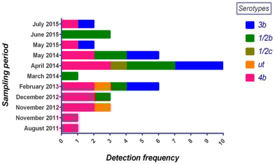 Frequency of L. monocytogenes serotypes found in this study between 2011 and 2015. “ut” indicates isolates that are untypeable using the slide agglutination method.