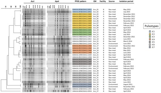 PFGE typing, using AscI-ApaI enzymes, revealed 7 clusters: JC1-7, and a total of 18 pulsotypes across facilities A and B (Figure 2). Isolates JLm_1 and 2 (n = 2) constituted cluster JC1 (PFGE pattern combination GXA16.0038/GXA12.0052) and represented 5.4% of the total isolates. Both isolates originated from raw meat in facilities A and B during May and July 2015, respectively.