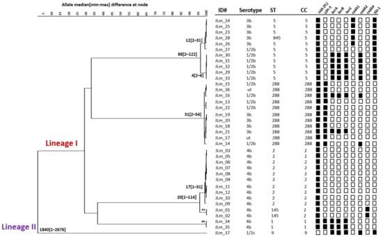 Phylogenetic analysis of 37 L. monocytogenes isolates using wgMLST, and distribution of important virulence-associated genes: shaded squares indicate presence of the gene in the corresponding genome; unshaded squares indicate absence.