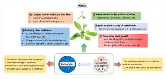 Overall, a precise understanding of these “biocontrol agents” is important for helping plants to overcome different stress conditions. Here, we summarize several critical mechanisms employed by endophytes, particularly their metabolites, that enhance host plant disease resistance. Using endophytes and their metabolites as biological control agents can be one of the most effective ways to improve crop quality, increase yields, and achieve sustainable agriculture under the premise of minimizing the harm to the environment and humans.