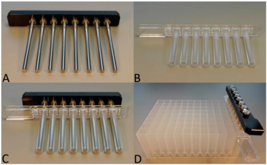 Materials used for the TripleE system. (A) In-house-self-made magnetic 8-channel. (B) IndiMag 48 PW Rod cover. (C) Magnetic channel combined with rod cover. (D) Magnetic-tip comp inserted into the park position in column 12 of the IndiMag 48 PW 24- Sample Block.