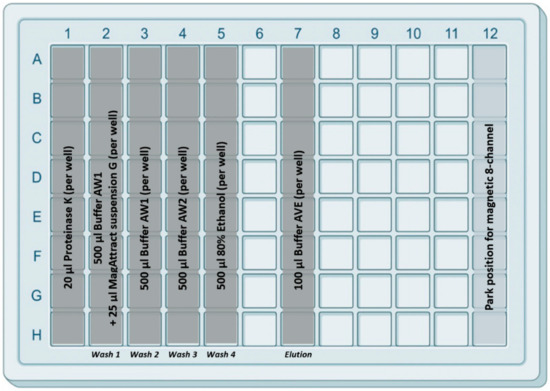 Before the extraction could be started, plates were prepared as follows. IndiMag Pathogen Kit buffers were placed in the IndiMag 48 PW 24-Sample Block (96-deep well plate) as described in Figure 2. Briefly, in column 1, the proteinase K (20 µL/well) was placed. In column 2, the first washing buffer AW1 (500 µL/well) mixed with the magnetic beads (25 µL MagAttract suspension G/well) were located. In columns 3, 4 and 5, three further washing buffers (AW1, AW2 and ethanol (80%)) were placed (500 µL/well). In column 7, the AVE elution buffer (100 µL/well) was filled. The separate location of the elution buffer should minimize the risk of contamination during the extraction procedure. Subsequently, the prefilled 96-deep well plate was covered with a Thermo-Bond Heat Seal foil (Biozym Scientific, Oldendorf, Germany) and heat-sealed for 4 s at 175 °C using the Sally Heat Sealer (Biozym Scientific). Prefilled plates were stored at room temperature (RT) until further use.