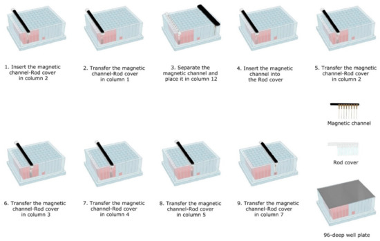 - Elution step: Finally, the magnetic channel-rod cover with the attached magnetic beads was inserted into column 7 (Figure 3—9) and was dipped up and down 30 times, again followed by a dipping step consisting of 10 slower movements for catching the maximum number of magnetic beads. Thereafter, the rod cover and the attached magnetic beads were discarded. The ready-to-use nucleic acids remained in column 7 for subsequent real-time PCR amplification or other molecular analyses.