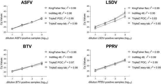 Finally, the analytical sensitivity of the four extraction methods was tested for each virus by performing a ten-fold dilution series of virus-positive samples. Overall, all extraction systems allowed viral detection up to a 10−4 dilution. Linearity for ASFV and PPRV indicated a 0.99 correlation coefficient, while LSDV and BTV ranged from 0.83 to 0.97 for the TripleE system (see Figure 5).