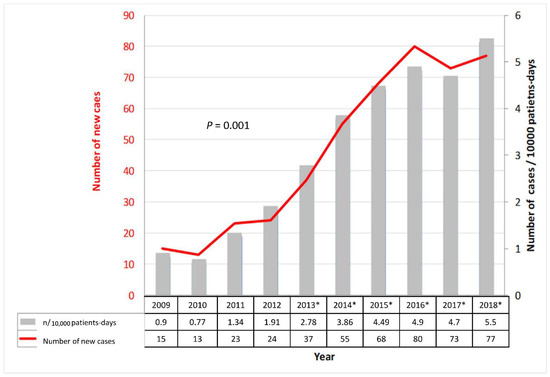 The overall mean incidence of CDI over the period 2009–2018 was 3.12 cases per 10,000 patient-days with a significant increase in incidence from 0.9 in 2009 to 5.5 in 2018 (p < 0.01) (Figure 1).
