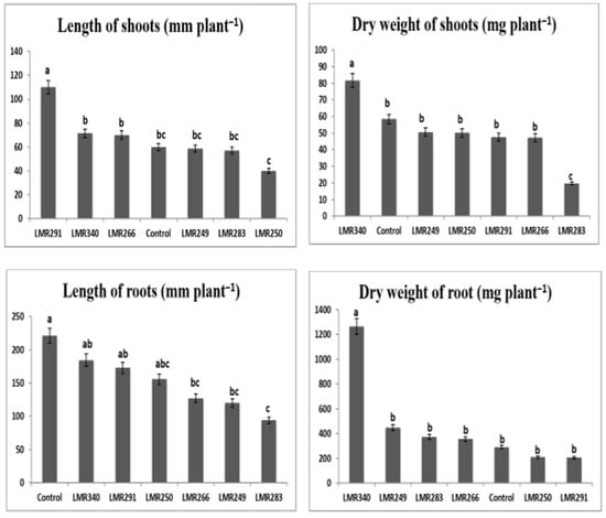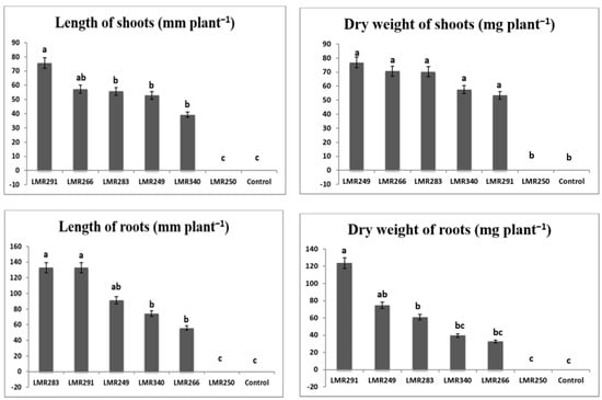 The results revealed that the strain LMR291 had the best impact on the growth of Sulla plants in the contaminated soil, with a significantly higher shoot and root lengths (75.71 and 132.85 mm, respectively) when compared to the other strains. Furthermore, root weight was significantly higher to that obtained with the other inoculant strains (123.84 mg plant−1), while all shoot weights were significantly equivalent except for the control plants and those inoculated with the strain LMR250.