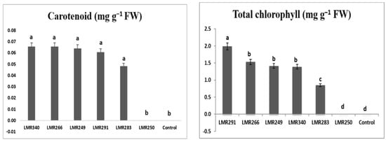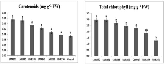 Sulla inoculation with selected bacterial strains, especially LMR340 (Rhodococcus qingshengii) and LMR291 (Pseudarthrobacter oxydans), led to higher chlorophyll content (2.98 mg g−1 FW), with values statistically comparable to those of the control plants and those inoculated with the three other strains. Shoot carotenoid content also showed positive effects for all strains used as inoculants, but differences were not significant (Figure 2).