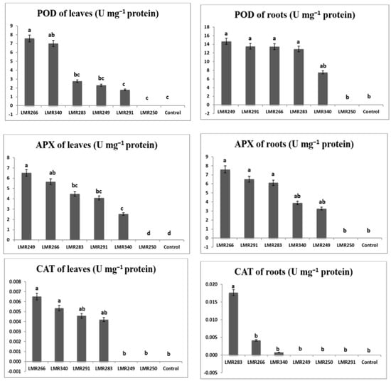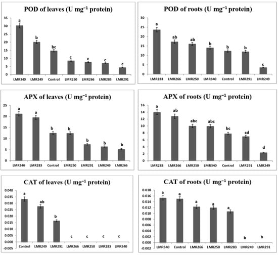 In leaves, CAT activity was significantly higher in plants inoculated with LMR266, LMR340, and LMR291 (0.01 U mg−1 proteins) than plants inoculated with LMR249. In roots, CAT activity was significantly higher in plants inoculated with LMR283 (0.02 U mg−1 proteins) (Figure 7).