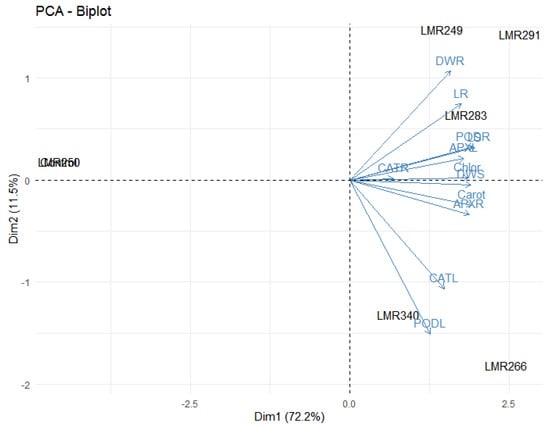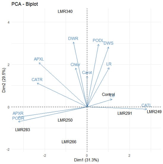 The correlation biplot between the Dim1 and Dim2 showed the 60.8% variation in which Dim 2 contributed 29.5% and Dim 1 contributed 31.3%. Strongly and positively correlated variables were very close to each other and present in the same quadrat. The blue color showed correlation between parameters (LS, LR, DWS, DWR, Chlor, Carot, PODL, PODR, APXL, APXR, CATL, CATR) while the black color showed correlation within treatments (Control, LMR249, LMR250, LMR266, LMR283, LMR291, LMR340).LS: Length of shoots, LR: Length of roots, DWS: Dry weight of shoots, DWR: Dry weight of roots, Chlor: Total chlorophyll, Carot: Carotenoids, PODL: POD of leaves, PODR: POD of roots, APXL: APX of leaves, APXR: APX of roots, CATL: CAT of leaves, CATR: CAT of roots.