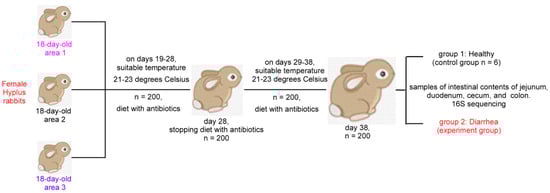 In this study, two hundred 38-day-old female Hyplus rabbits from three areas of Zhongtian rabbit farm were selected. The whole experimental workflow is shown in Figure 1. These rabbits were fed a diet containing antibiotics for 10 days before weaning and had stopped using the diet containing antibiotics for 10 days after weaning. All rabbits were raised under standard farm management conditions and were routinely vaccinated. At the end of the experiment, 6 rabbits from the normal condition were selected as the control group (Con, n = 6) and 6 rabbits from the disease condition (diarrhea) were selected as the experiment (diarrhea) group (Dia, n = 6) according to their weight, physiological condition and health status [26]. Each rabbit was fed 150–200 g diet per day and lived separately in a clean cage (600 × 600 × 500 mm, 21–23 °C, 60–75 % humidity, 14 h light (60 lx)) [20]. These animals had free access to fresh water. After 24 h without food, 12 rabbits were euthanized under anesthesia. Samples of the contents of the FIS (including cecum, colon, duodenum, and jejunum contents) were immediately collected in 2 mL freezing tubes, which were frozen in liquid nitrogen and stored at −80 °C for subsequent tests.