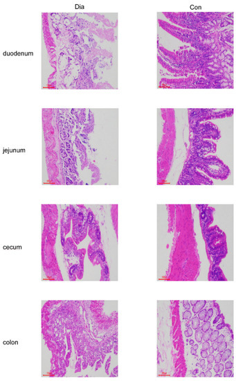 Hematoxylin and eosin stained duodenal, jejunum, cecum, and colon tissue samples from Dia (n = 6) and Con (n = 6) Hyplus rabbits caused by stopping the use of antibiotic diet. Con, control group; Dia, diarrhea group.