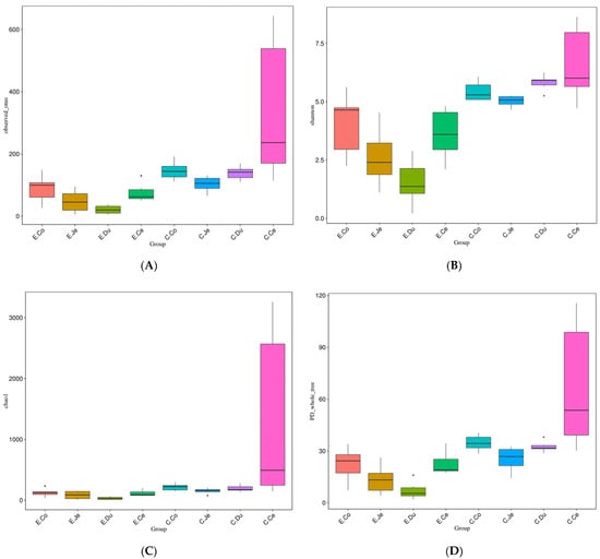 Analysis of alpha diversity index of bacteria of four intestinal segments (FIS) in Dia (n = 6) and Con (n = 6) Hyplus rabbits caused by stopping the use of antibiotic diet. (A) Observed_OTUs (species) in the four intestinal regions. (B) Shannon index of the four intestinal regions. (C) Chao1 index of the four intestinal regions. (D) PD_whole_tree of the four intestinal regions. C, control group (Con, n = 6); E, diarrhea group (Dia, n = 6), Co, colon; Ce, cecum; Du, duodenum; Je, jejunum.