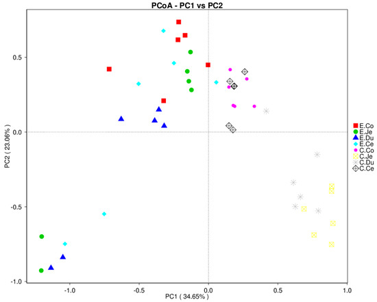 Analysis of beta diversity index of bacteria in four intestinal segments (FIS). Principle coordinates analysis (PCoA) of bacterial communities in FIS of Dia (n = 6) and Con (n = 6). The PCoA of bacterial communities in all samples based on weighted Unifrac. C, control group (Con, n = 6); E, diarrhea group (Dia, n = 6), Co, colon; Ce, cecum; Du, duodenum; Je, jejunum.
