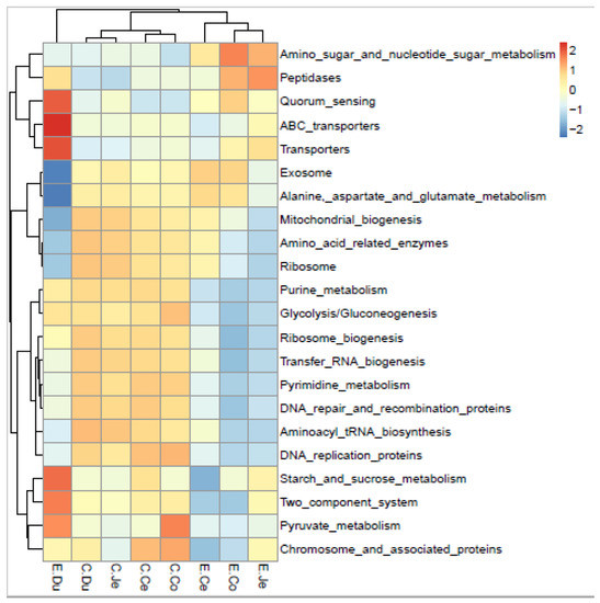 Heatmap of relative abundance of the dominant KEGG orthologs (KOs) pathway at the third level (the pathway with average relative abundance ≥1% in at least one region in FIS of Hyplus rabbits). C, control group (Con, n = 6); E, diarrhea group (Dia, n = 6); Co, colon; Ce, cecum; Du, duodenum; Je, jejunum.