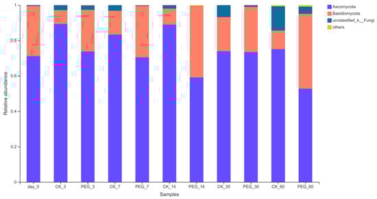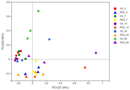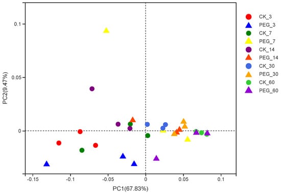 As a result, the richness of the microbial community decreased in both the control and treated groups with prolonged ensiling. Addition with PEG, however, increased (p < 0.05) the diversity of the microbial community after 3 days of ensiling. There was no difference (p > 0.05) in microbial-community diversity between the control and PEG treatments during ensiling days 7 to ensiling days 60. Addition with PEG decreased (p < 0.05) the richness of the microbial community during 30 days of ensiling. In addition, weighted UniFrac distance was used to assess fungi communities, as shown in Figure 4.