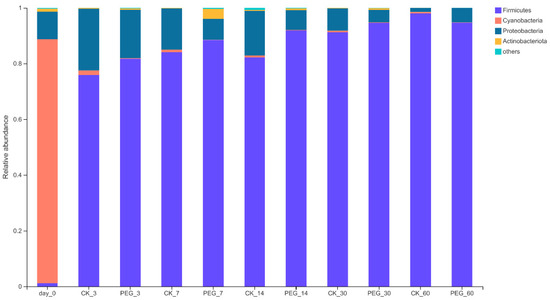 After 60 d of ensiling, Firmicutes became the dominant phylum in both groups, with a relative abundance of 94.52–97.97%; however, the Cyanobacteria relative abundance dropped to 0.12–0.49%. Similar results were observed in [18], except in this study no difference of bacterial relative abundance was found at the phylum level between the control and PEG groups. Such a discrepancy in different studies indicates that there are differences in the bacterial succession in silages using different raw materials, even if the raw materials contain the same type of bacterial communities.