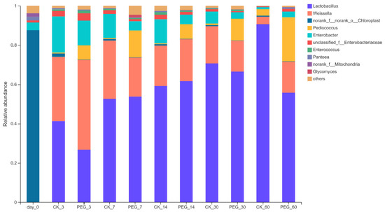 Analyzing the bacterial community on the genus level (Figure 3) showed that there was a significant difference between the control and PEG silages. In general, Weissella, Lactobacillus, Enterobacter and Pediococcus were the four richest bacterial communities on the genus level. During the ensiling process, the Lactobacillus relative abundance increased as the days of ensiling increased. The Lactobacillus relative abundance of the control and PEG groups was 42.06–90.56% and 27.4–69.92%, respectively. The Enterobacteria relative abundance decreased with ensiling days, with a relative abundance for the control and PEG groups at 1.04–11.92% and 2.78–12.66%, respectively. The Weissella relative abundance slightly decreased after 7 d of ensiling, then stabilized until 30 d of ensiling in the control silage. After 60 d of ensiling, the Weissella relative abundance dropped considerably to 3.85% in the control silage. The Weissella relative abundance in the PEG silage decreased slightly for 7 d but stabilized for the remaining ensiling. Pediococcus showed the most significant difference in relative abundance of the LAB bacteria (p < 0.05), with the Pediococcus relative abundance for the control and PEG group at 0.37–3.38% and 7.82–23.5%, respectively.