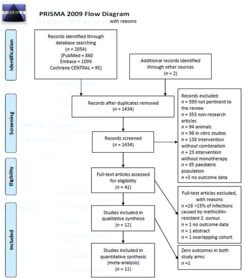 Titles and abstracts were screened for eligibility. Two independent researchers reviewed full-text articles and abstracted data using a standardized abstraction form. Data collected included study design and population, number of patients, S. aureus resistance to methicillin, antibiotics evaluated, and outcomes. We also recorded variables associated with better SAB survival: echocardiography use, infectious diseases (ID) consultation, and adherence to quality-of-care bundle interventions [,]. Disagreements between reviewers were resolved by consensus. When two articles had overlapping study populations, the more comprehensive was included.