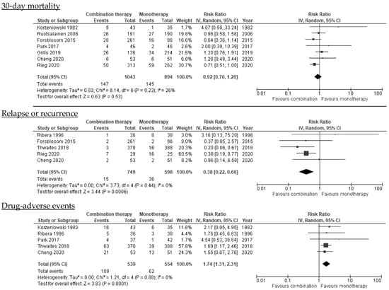 We used random-effects models with inverse variance weighting to estimate pooled risk ratios (pRR). Studies with no events (outcomes) in either study arm were omitted from the meta-analysis. For RCTs, intention-to-treat data were used whenever possible. We grouped studies that assessed 28-day mortality with those reporting 30-day mortality, and reported combined pRRs. If different endpoints for mortality were reported, we preferably evaluated 30- and 90-day mortalities. We assessed heterogeneity using the Cochrane Q statistic and the I2 test. Publication bias was assessed through visual inspection of funnel plots and the Egger test. For mortality, we performed subgroup analyses based on a priori selected variables: study design, antibiotic in combination, source of infection, and indication of the combination therapy (persistent bacteremia vs. early therapy). Deep-seated infections included osteoarticular infections, endocarditis, deep-seated abscesses, or foreign body infections. Statistical analyses were performed using the Cochrane Review Manager (RevMan, version 5.3), Comprehensive Meta-Analysis Version 3 software (Englewood, NJ, USA), and Excel 2007.