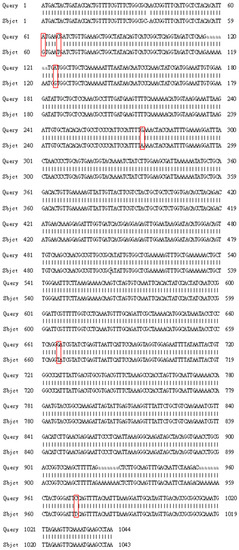 Comparison of the ari1 DNA sequence for ari1 obtained in this study with that published by Liu et al., 2009. Query: The ari1 DNA sequence published by Liu et al., 2009. Subject: The ari1 DNA sequence from this study. It is shown that the DNA sequence of this study is different from that of Liu et al.