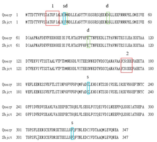 Comparison of the amino acid sequence for the ARI protein obtained in this study with that published by Liu et al., 2009. Query: The ARI amino acid sequence published by Liu et al., 2009. Subject: The ARI amino acid sequence in this study. 1 Cofactor binding site, 2 Active site, s DNA sequences were different from those of Liu et al. but their amino acids were the same. d Both DNA sequences and amino acids were different from those of Liu et al., 2009.
