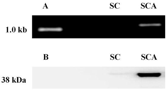 A DNA fragment appeared in the position at about 1.0 kb, which corresponds to the ari1 gene (1044 bp was expected) in SCA (Figure 3A), whereas no PCR product was generated in the parental strain (SC). The result of Western blotting probed with an anti-His label (Figure 3B) confirmed that the SCA-expressed protein was in the range of 35~48 kDa, which matches the molecular weight of aldehyde reductase reported by Moon and Liu [18]. Again, SC did not produce the target protein band. The results of PCR and Western blot confirmed that ari1 was successfully recombined and expressed in SCA.