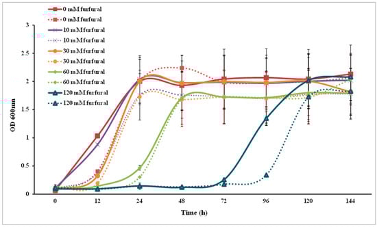 Furfural tolerance analysis of Saccharomyces cerevisiae. Solid lines represent engineered strains; dashed lines represent wild strains.