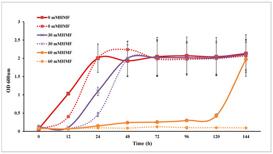 HMF tolerance analysis of Saccharomyces cerevisiae. Solid lines represent engineered strains; dashed lines represent wild strains.