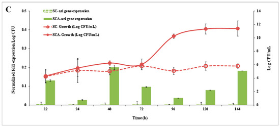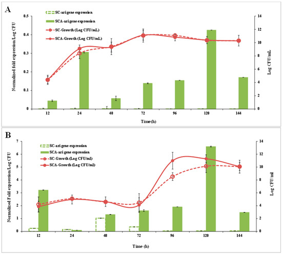 SC did not show ari1 gene expression within 144 h of culturing in the YPD broth, while SCA showed ari1 gene expression after 24 h of culturing. The expression of ari1 in SCA was highest at 120 h-4.4-fold higher than that in SC. Although the growth patterns of SC and SCA were not significantly different, the expression of the ari1 gene was higher in SCA than that in SC (Figure 6A).