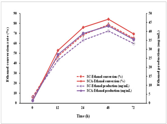 To evaluate the ethanol-producing capacity of the engineered strain, SCA was incubated in a high-glucose YPD broth (containing 10% glucose). After 48 h of incubation, both SC and SCA produced the largest amount of ethanol, with ethanol concentrations of 40.21 and 43.03 mg/mL, respectively (Figure 8); the conversion rates were 78.69 ± 1.88% and 84.21 ± 2.13%, respectively. SCA can more efficiently produce ethanol than its parent strain (SC).