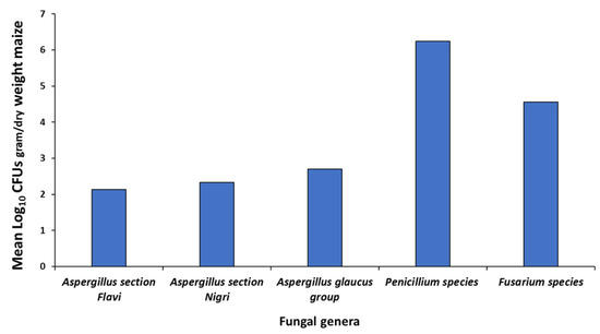 Mean fungal populations (Log10 CFUs/g maize) isolated from the naturally contaminated maize using serial dilution.