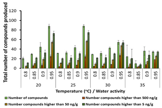 Figure 2 shows that number of SMs found in the stored maize grain at different temperature × aw conditions. The total number of SMs present was maximum at 20 and 25 °C, especially with more available water at 0.95 aw. At both 30 and 35 °C, fewer SMs were present and at lower concentrations. There was a significant gradual increase in the number of SMs, and the numbers present at >500 ng/g as the aw was increased from 0.80–0.85 to 0.95 and all the temperatures were examined. Supplementary Materials Table S1 provides the statistical analyses of all the SMs and those produced at >500 ng/g in relation to the temperature and aw conditions tested.