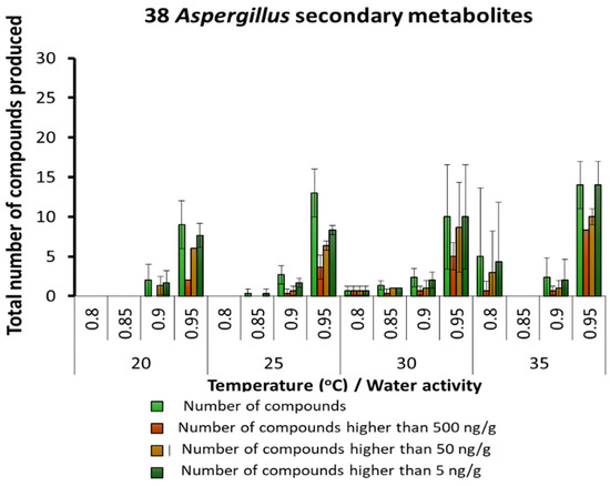 Summary of the predominant secondary metabolites (µg/g) and their concentrations detected and produced by species of the Aspergillus genus in maize grain stored under different temperature × water activity conditions; Bars represent the Standard Error of the mean.