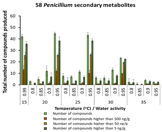 Summary of the predominant secondary metabolites detected in maize produced by species of the Penicillium genus stored under different temperature × water activity conditions. Bars represent the Standard Error of the mean.