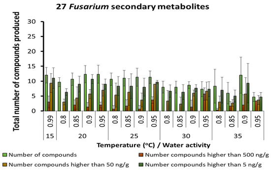 Summary of the predominant secondary metabolites of Fusarium species detected in maize grain stored under different temperature × water activity conditions. Bars represent the Standard Error of the mean.