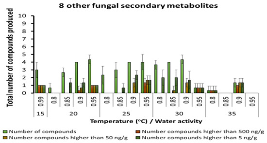A few other fungal SMs were produced but in very low concentrations, regardless of the interacting abiotic conditions (Figure 6). These were generally produced in low concentrations, especially at 20–30 °C and 0.90 and 0.95 aw. Other unspecified SMs were found in the maize varying from 10–20 depending on the temperature and aw conditions. There was an increasing gradation of these SMs as more water was available in the substrate and at the temperature conditions examined (Figure 7).