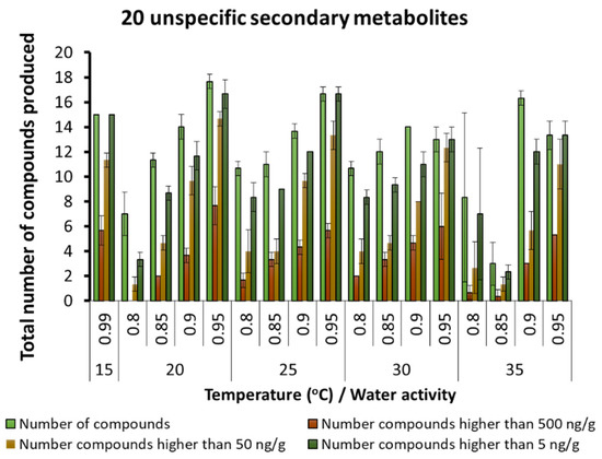 Unspecified secondary metabolites detected in the maize samples under different temperature × water activity conditions. Bars represent the Standard Error of the mean. Note change in scale to 0–20 metabolites.