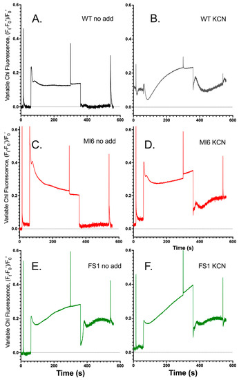 Illumination was ceased at 360 s, and the post-illumination increase in fluorescence yield is attributed to CEF. The WT and MI6 have very minimal fluorescence rises while FS1 has a large rise that appears to include both the fast and slow components. The fast components (<10 s post-illumination) are associated with direct CEF involving NADPH and reduced ferredoxin, whereas the broad slow component (~30 s post-illumination) reflects reoxidation of photosynthetically produced sugars (Figure 1A,C,E) [12]. This indicates that in the WT and MI6 under these conditions, electrons are not flooding back into the PQ pool via redox complexes, primarily NDH-1 [8,14], after illumination, or if they are, they are being removed from the PQ pool at a similar rate to that which they are entering. This is not the case in FS1, where electrons flood the PQ pool after illumination, and the input of electrons into the PQ pool outpaces the consumption of those electrons after illumination indicated by the pronounced post-illumination rise in fluorescence relative the wild type (Figure 1E). This reflects the hypothesized role of FNRS in its participation in CEF [16,18].