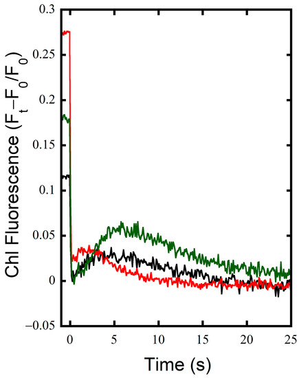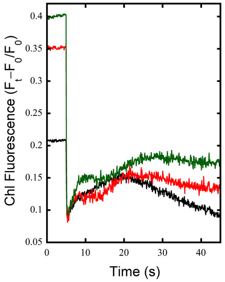 To further investigate the post-illumination Chl fluorescence rise in the absence of inhibitors, 15 s illuminations on dark-adapted samples were performed. Illuminations of this length are long enough to generate a substantial pool of photosynthetic reductant as NADPH and reduced ferredoxin, yet too short for the full activation of the CBB cycle. The FS1 and WT had similar initial slopes of the post-illumination fluorescence rise; however, the FS1 had a greater magnitude, which is associated with greater CEF activity, especially via NDH-1 [13] (Figure 3). The MI6 mutant, on the other hand, had a small rise, with dissipation of the post-illumination fluorescence occurring well before either FS1 or the WT had reached their peak and begun their own dissipations (Figure 3). These results indicate that FS1 has enhanced CEF, MI6 has diminished CEF, and the WT is somewhere in between the two. Taken together, these results indicate that only having the FNRL in MI6 tends to shunt the reductant to CO2 reduction via the CBB with minimal CEF with the resultant more efficient oxidation of the PQ pool. With the ability to express only the short form of FNRS in FS1, CEF is maximized, resulting in enhanced re-reduction of the PQ pool at the expense of LEF.