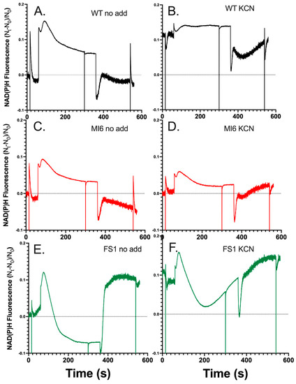 Upon the addition of KCN, the WT almost entirely reduced its NADPH pool in the dark, as upon illumination there is little increase in fluorescence (Figure 4B). There is a transient oxidation, and then NADPH fluorescence rises slowly and reaches a steady state for the rest of illumination. Given that the PQ pool is almost entirely reduced over the course of illumination (Figure 1B), NADPH might be as reduced as it can be as well, representing an acceptor side limitation. The MI6 has similar characteristics of fluorescence as before treatment with KCN; however, the initial rise in fluorescence upon illumination is diminished (Figure 4D). It also does not show strong reduction in the dark, or even during illumination, perhaps showing NADPH oxidase activity. A decrease in fluorescence is seen after the transient peak, indicating dissipation of reductant by CO2 fixation. At the beginning of post-illumination NADPH fluorescence of MI6 rises to a greater magnitude than the WT but with a similar slope, and the pool continued to reduce over time. In the dark, FS1 had a similarly reduced NADPH pool to the WT, and interestingly, upon illumination and after its transient peak, had a strong oxidation of the NADPH pool, though not quite as quickly or deeply as without KCN, followed by a slow and steady rise in fluorescence which seems to continue at a similar rate after the oxidation and subsequent reduction of NADPH after termination of illumination (Figure 4F). The post-illumination rise was much smaller in magnitude than without KCN treatment, but still greater compared to the other strains (Figure 4E,F). Together with the chlorophyll fluorescence data (Figure 1), the NADPH fluorescence data indicate that FNRS pulls electrons away from the NADPH pool and allows their input into the PQ pool to a greater degree than does FNRL. While it is difficult to compare the physiological conditions exactly, this accords with the previous findings that the NADP+/NADPH ratios were about 2.6 and 2.0 for the wild type and MI6, respectively. In contrast, the reported ratio was about 4.3 in FS1, indicating a much more oxidized NADPH pool [17].