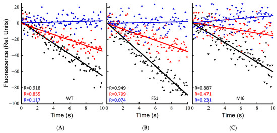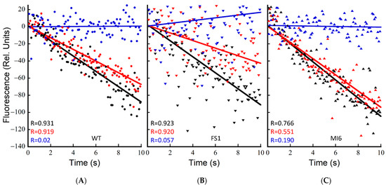 To investigate the ability of these strains to power CEF-driven proton pumping and determine if Fd is indeed being reduced by the strong NADPH oxidation seen in FS1 to power CEF, ∆pH formation upon actinic illumination was measured by acridine orange (AO) fluorescence quenching. This assay was performed essentially as described previously [8]; however, the buffer used included 25 mM KCl (TCK buffer) rather than 25 mM NaCl (TCN). Upon switching the buffer, the rates of AO quenching dramatically reduced from those reported in TCN buffer (Supplementary Figure S1). The fast rate of quenching in the TCN buffer was shown to be Na+ gradient-dependent, as the addition of 50 µM monensin dissipated the gradient, reducing the rates to approximately those seen in TCK buffer, indicating that the Na+ gradient plays a part in light-induced PMF formation, perhaps by modulating the concentration of positive charges across the thylakoid. As discussed below, subtler changes in AO fluorescence quenching may be observed in TCK buffer, and it enhances the proportion of PMF formation driven by CEF. Because NDH-1 complexes have been shown to be the primary contributors to CEF-driven proton pumping in the dark–light transition in cells treated with DCMU [8], and their primary reductant source is reduced Fd [14], the action of FNRS as an NADPH oxidizer should be most clearly seen when PSII is inhibited. While the action of an alternative CEF pathway such as PGR5 is unable to be excluded in its activity here, based on previous data it is likely that in these conditions the ∆pH formation is due to CEF via NDH-1 complexes [8]. The background inhibitors KCN, valinomycin, and DCCD were utilized as described previously to allow for the measurement of near-maximal rates of proton pumping [8]. In dark-adapted cells, FS1 has a significantly faster rate of quenching than the WT with only the background inhibitors, but the rates are not significantly different when DCMU is added to dark-adapted cells (p = 0.88) (Figure 5A,B and Table 1). The mutant MI6, lacking FNRS, was not significantly different from the WT with only the background inhibitors in dark-adapted cells (p = 0.35); however, it was significantly slower than either the WT or FS1 when DCMU was added (Figure 5C and Table 1). The ability for CEF to compensate for the loss of LEF in MI6 is greatly reduced from that of the WT or FS1, operating at ~27% of the rate of the no-DCMU control, while WT and FS1 operate CEF-driven proton pumping at ~50% and 39% of the rate, respectively. These data indicate that in dark-adapted cells FNRS is a better supplier of Fdred for NDH-1-driven proton pumping than FNRL is, and that the WT can match the rate of FS1 due to its limited presence of FNRS.