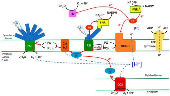 - Nikkanen, L.; Solymosi, D.; Jokel, M.; Allahverdiyeva, Y. Regulatory electron transport pathways of photosynthesis in cyanobacteria and microalgae: Recent advances and biotechnological prospects. Physiol. Plant 2021, 173, 514–525. [Google Scholar] [CrossRef] [PubMed]