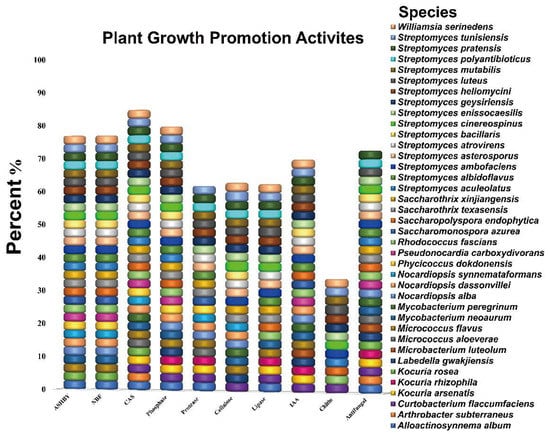 In the present investigation, it has also been documented that endophytic actinobacterial strains exhibited multiple plant beneficial activities, such as the production of IAA (69%), siderophores (84%), phosphate solubilization (79%), and nitrogenase activity (76%). The findings of our study are parallel to some of the previous investigations which reported that endophytes produced several plants promoting traits including the production of phytohormones, siderophores, phosphate solubilization, nitrogenase activity, and cell-wall-degrading enzymes [48,65,66,67,68,69,70]. In addition, many of the endophytic actinobacterial strains screened in this study were able to produce at least one of the hydrolytic enzymes. The production of cell-wall hydrolyzing enzymes such as cellulose (64%), protease (61%), lipase (62%), and chitinase (34%) are involved in minimizing the challenges imposed by phytopathogens and may play an important role in the biocontrol of plant diseases which have been well-documented previously by various researchers [26,48,53,71,72,73].