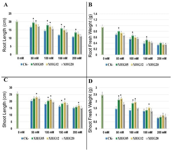 For instance, inoculation with strain XIEG05 showed the strongest stimulation of the cotton root length significantly (p < 0.05) by 16.5, 23.9, 34.4, and 25.1% at 50, 100, 150, and 200 mM NaCl, respectively, compared to the uninoculated controls (Figure 2A). In addition, strain XIEG05 increased the fresh weight of root by 17.4, 22.3, 30.8, 20.6% at 50, 100, 150, and 200 mM NaCl, respectively, compared to the uninoculated controls (Figure 2B). For shoot length, co-cultivation with strain XIEG12 showed the strongest stimulatory effect on cotton growth was obtained at 50, 100, 150, and 200 mM by 12.5, 18.9, 19.5, and 11.7%, respectively, compared to the uninoculated controls (Figure 2C). For shoot fresh weight, strain XIEG12 showed the highest increase significantly (p < 0.05) of the growth rate by 50.9, 43.3, 20.5, and 25.8% at 50, 100, 150, and 200 mM, respectively, compared to the uninoculated control (Figure 2D). Overall, our results showed that strains XIEG05, XIEG12, and XIEG20 enhanced plant tolerance to salt stress through the promotion of shoot and root development.