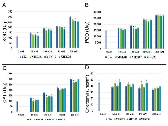 Salt stress induced production provokes oxidative stress (ROS) like superoxide dismutase (SOD), catalase (CAT), and peroxidase (POD). To minimize the deleterious effects of ROS, we investigated the effect of three endophytic actinobacterial strains, Streptomyces luteus (XIEG05), Nocardiopsis dassonvillei (XIEG12), and Alloactinosynnema album (XIEG20), which showed plant growth stimulation under saline conditions (50–200 mM NaCl) on cotton plant physiological parameters involved in defense systems against oxidative stress to cope with salinity stress. The results pertaining to the effects and alleviating of salt stress on antioxidant enzymes activities by all tested strains are reported in (Figure 3).